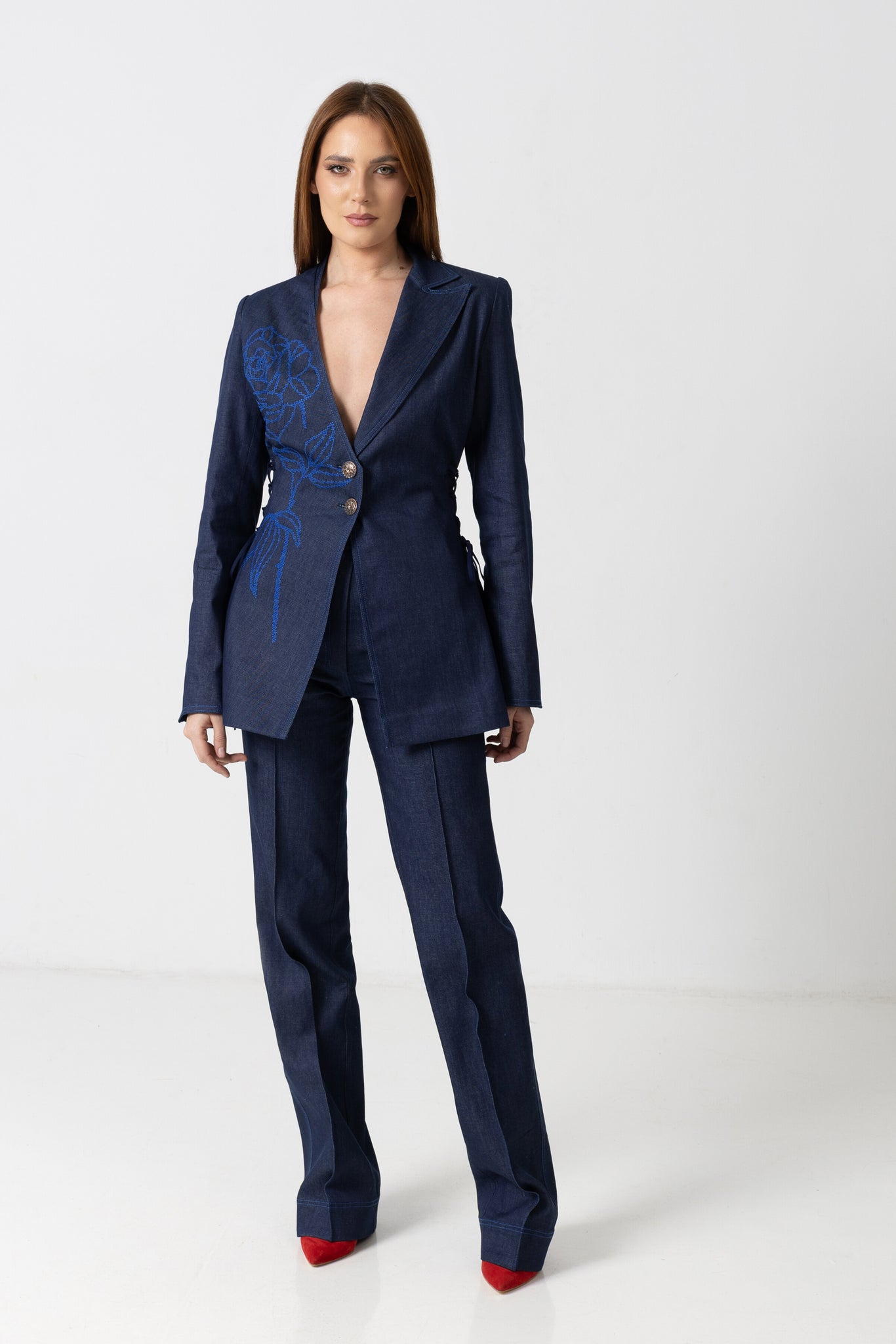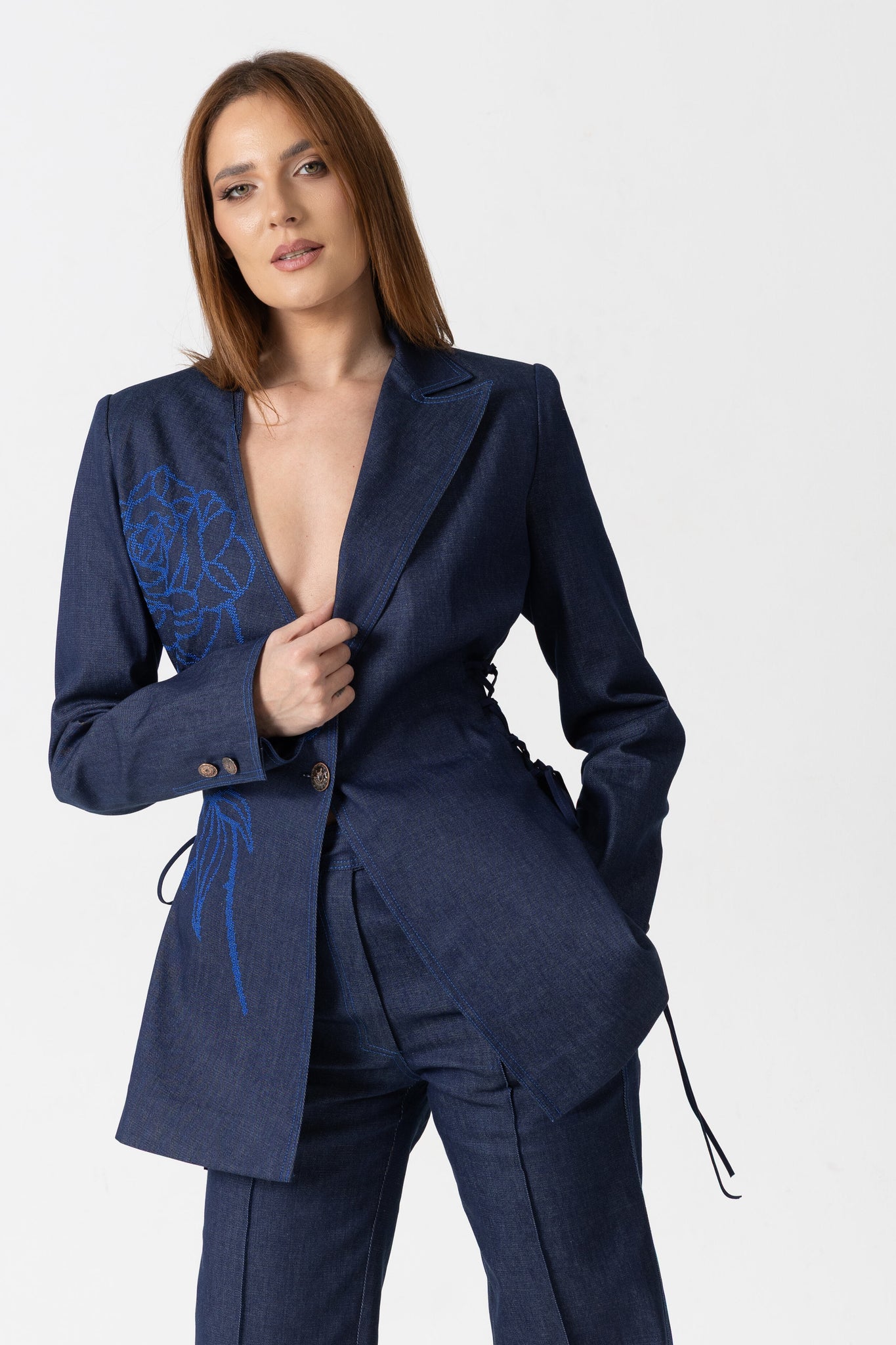 Un sacou inspirat din croiala masculină, această piesă reprezintă expresia perfectă a eleganței moderne, îmbinând structura impecabilă cu detalii feminine sofisticate. Realizat din denim albastru închis, sacoul se remarcă prin broderia cu trandafir în nuanțe de albastru intens, dispusă pe partea frontală, care adaugă un accent artistic și rafinat întregii piese.