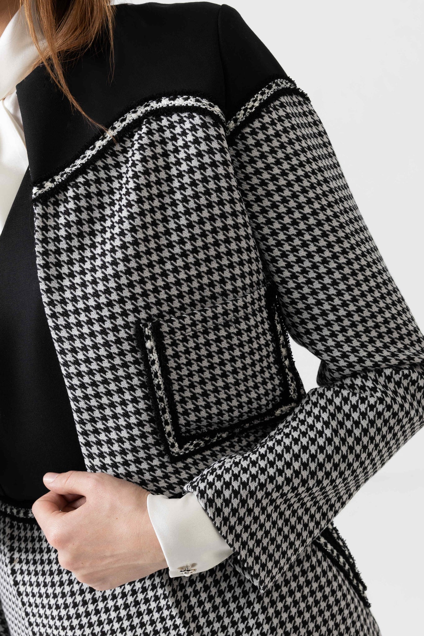 Sacou scurt realizat din stofă de lână de înaltă calitate, cu model clasic picior de cocos, reinterpretat într-o notă modernă și elegantă. Croiala structurată pune în valoare silueta, iar liniile curate sunt completate de inserțiile negre de pe bust și de finisajele decorative care conturează rafinat marginile sacoului. Lungimea scurtă și forma bine definită îi conferă versatilitate, transformându-l într-o piesă esențială pentru garderoba feminină.