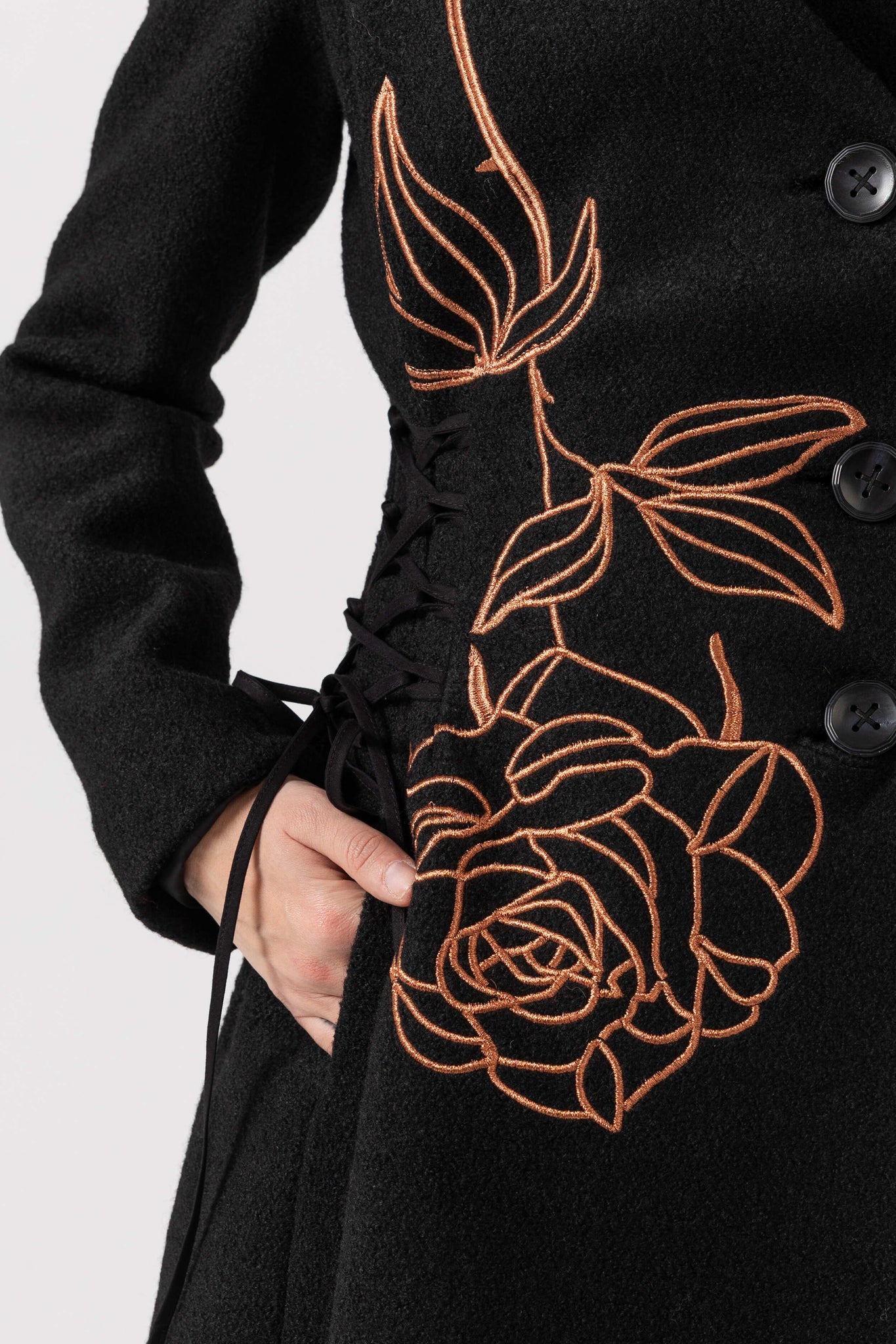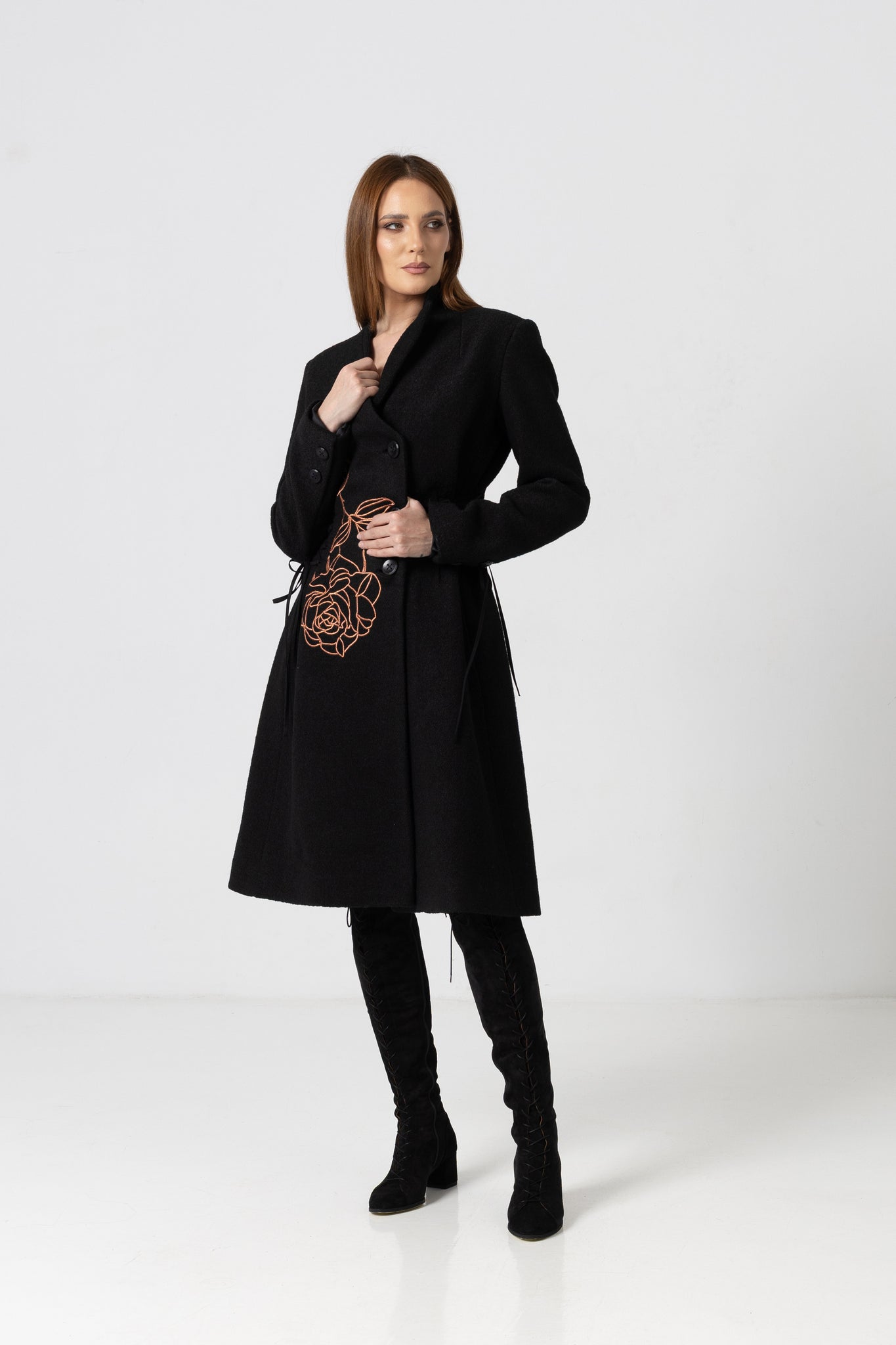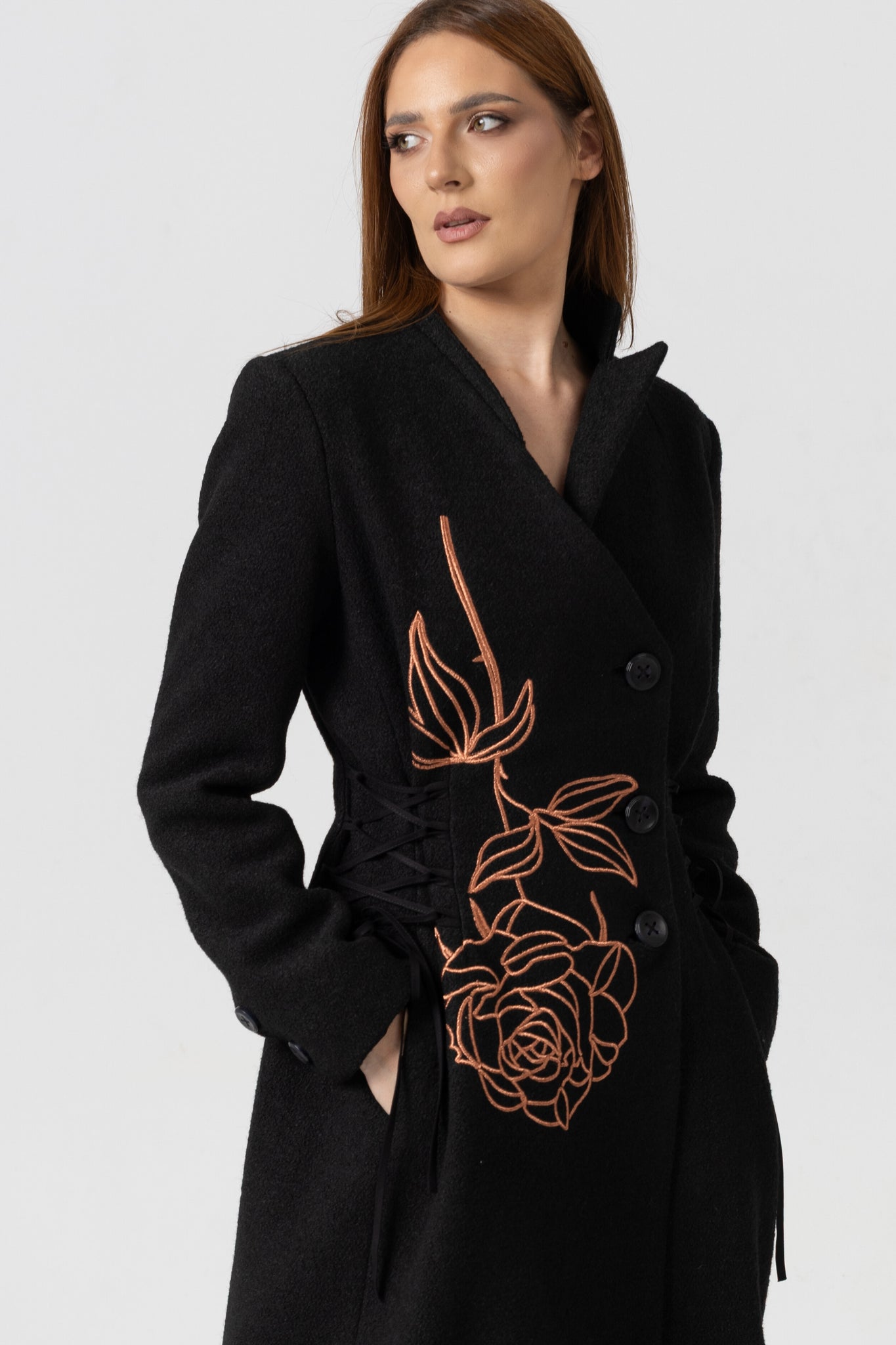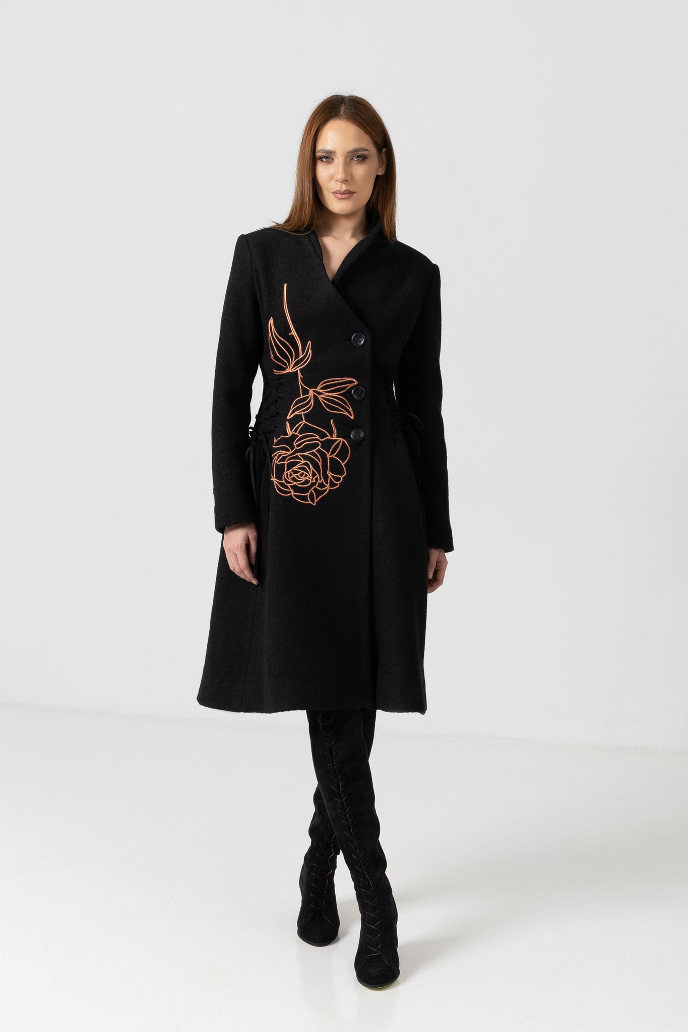 Paltonul din stofă de lână impresionează prin eleganța nuanței de negru și prin detaliile atent lucrate. Croiala modernă, cu accente inspirate din stilul masculin, este pusă în valoare de broderia cu fir metalic arămiu cu motiv de trandafir, care creează un contrast delicat și plin de rafinament. Gulerul asimetric lasă să se remarce broderia strălucitoare, oferind piesei un plus de personalitate.
