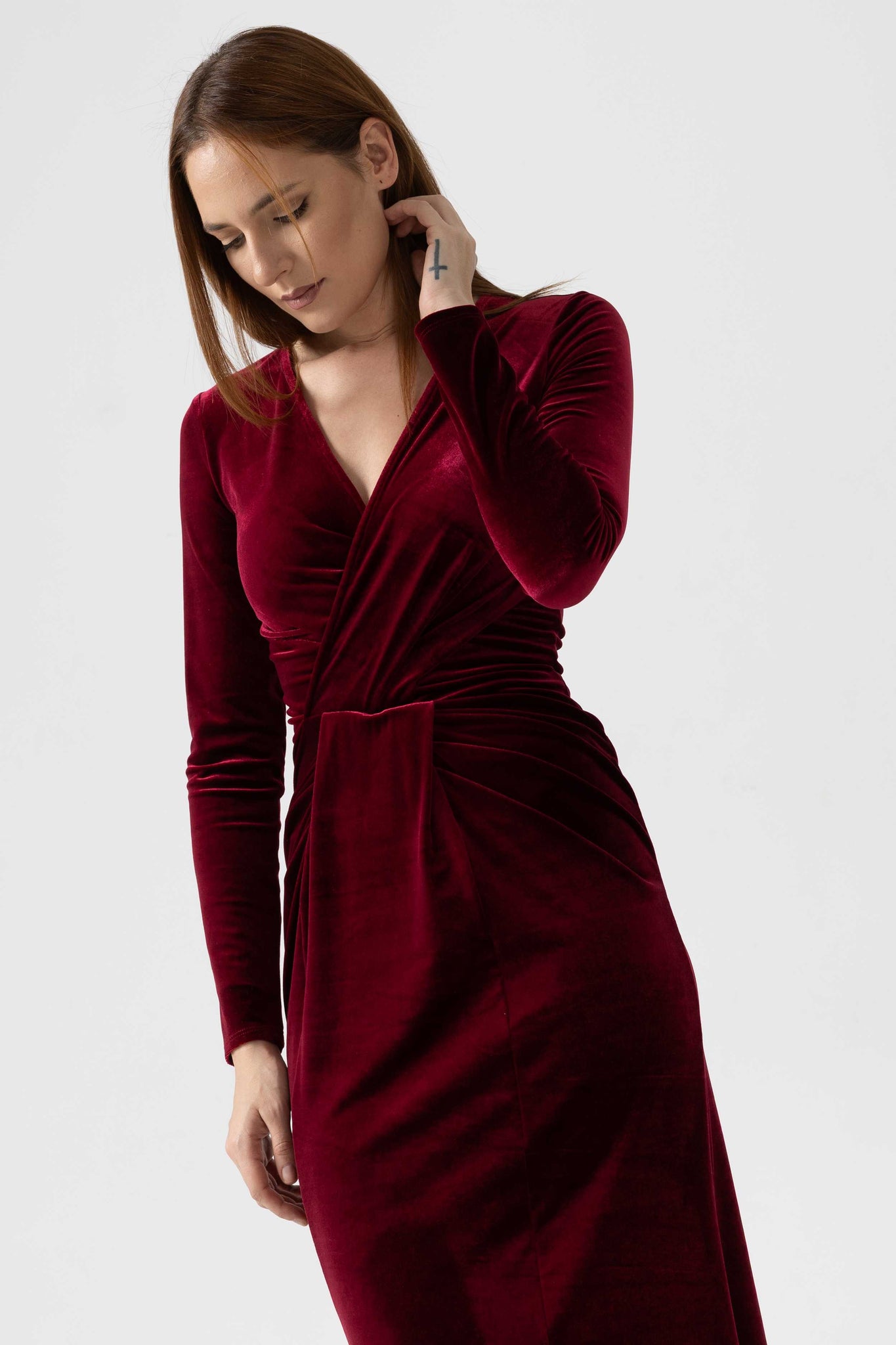 O piesă sofisticată, această rochie de lungime midi din catifea burgundy de calitate superioara este ideală pentru ținute elegante și apariții memorabile. Catifeaua fină, cu luciu subtil, oferă o textură luxoasă și o cădere lină, care pune în valoare silueta într-un mod natural și rafinat. Decolteul în V și partea frontală petrecută creează un efect feminin și alungit, iar drapajele atent realizate subliniază armonios linia taliei.
