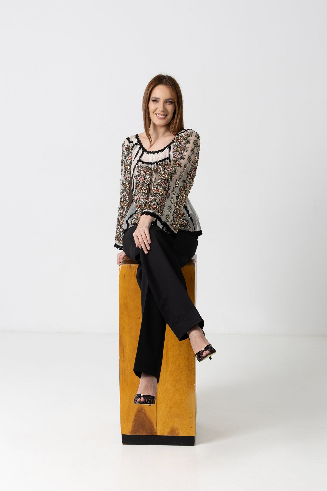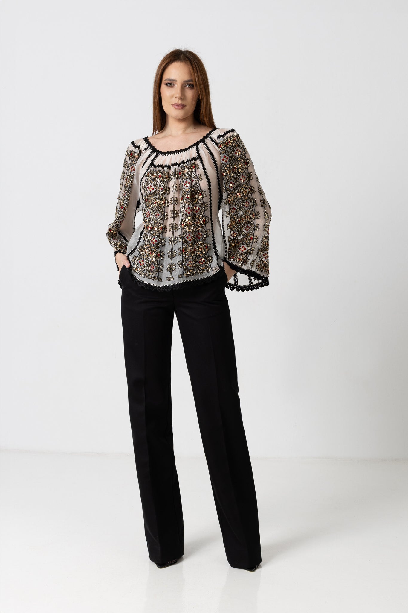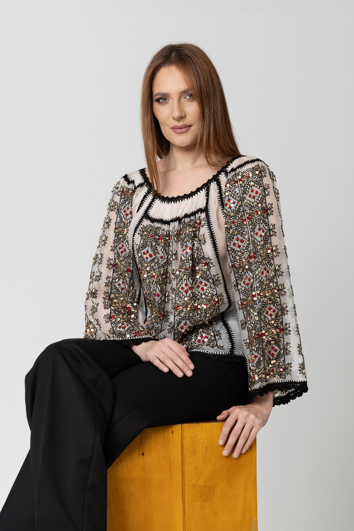 Inspirată din bluzele tradiționale argeșene, această ie modernă este cusută manual pe organza și decorată cu sute de mărgele și paiete aurii.
