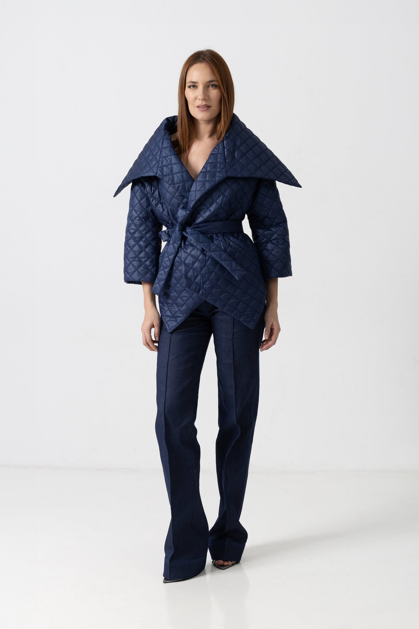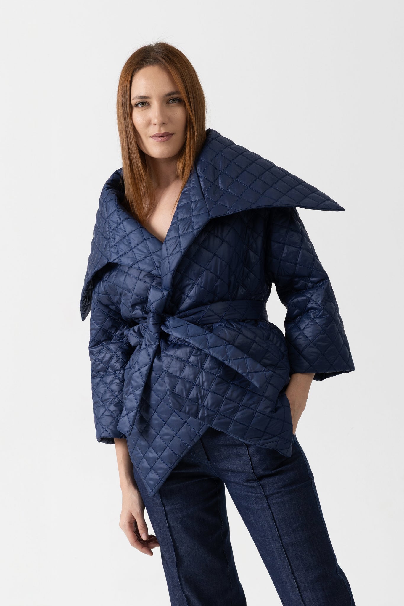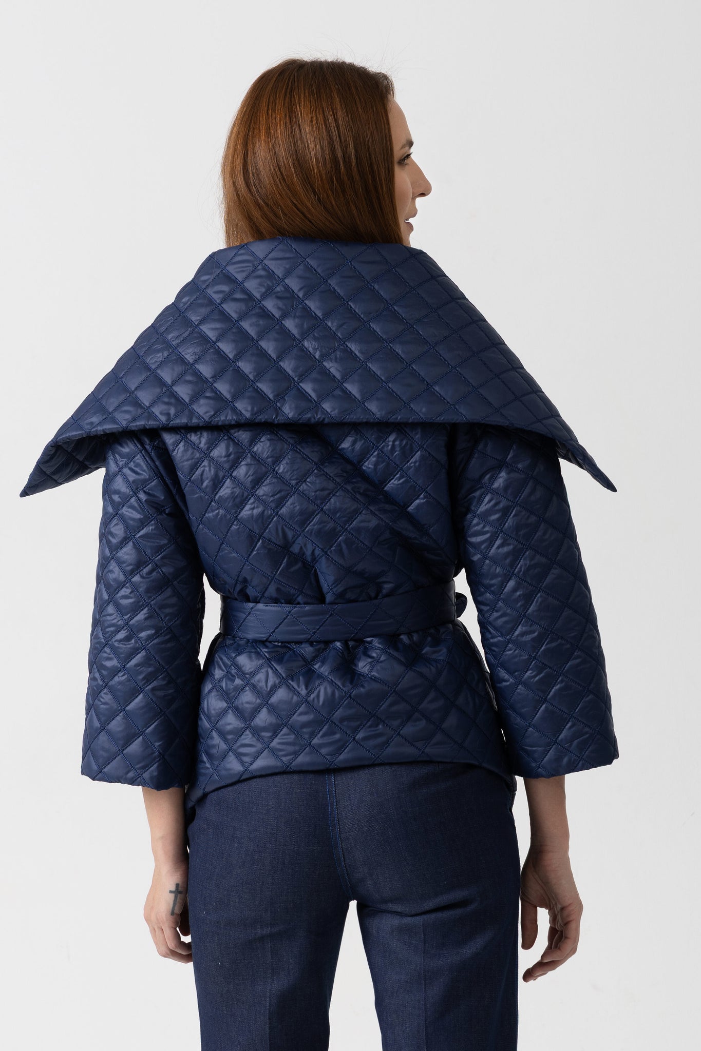 Jachetă scurtă din țesătură matlasată, cu un design modern, ușor asimetric și colțuri elegante în partea din față. Este prevăzută cu guler amplu reglabil, perfect pentru a ajusta lookul în funcție de stilul tău. Mâneca trei sferturi, amplă, poate fi îndoită și purtată tip mansetă pentru un plus de lejeritate.