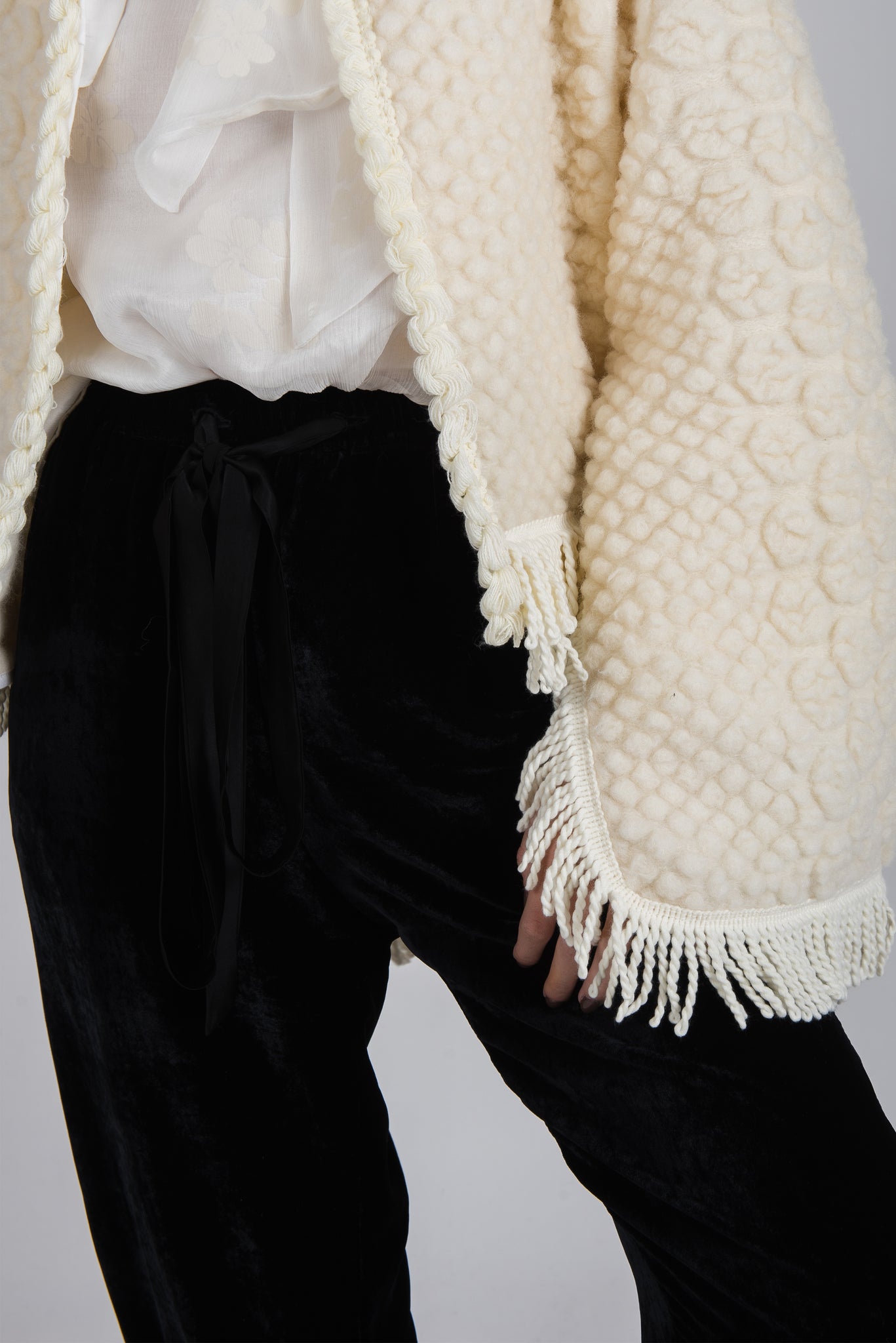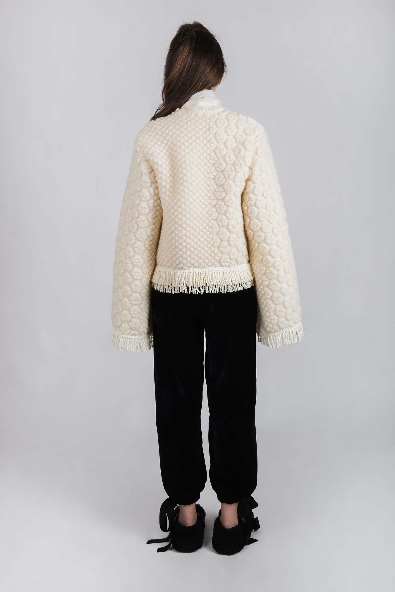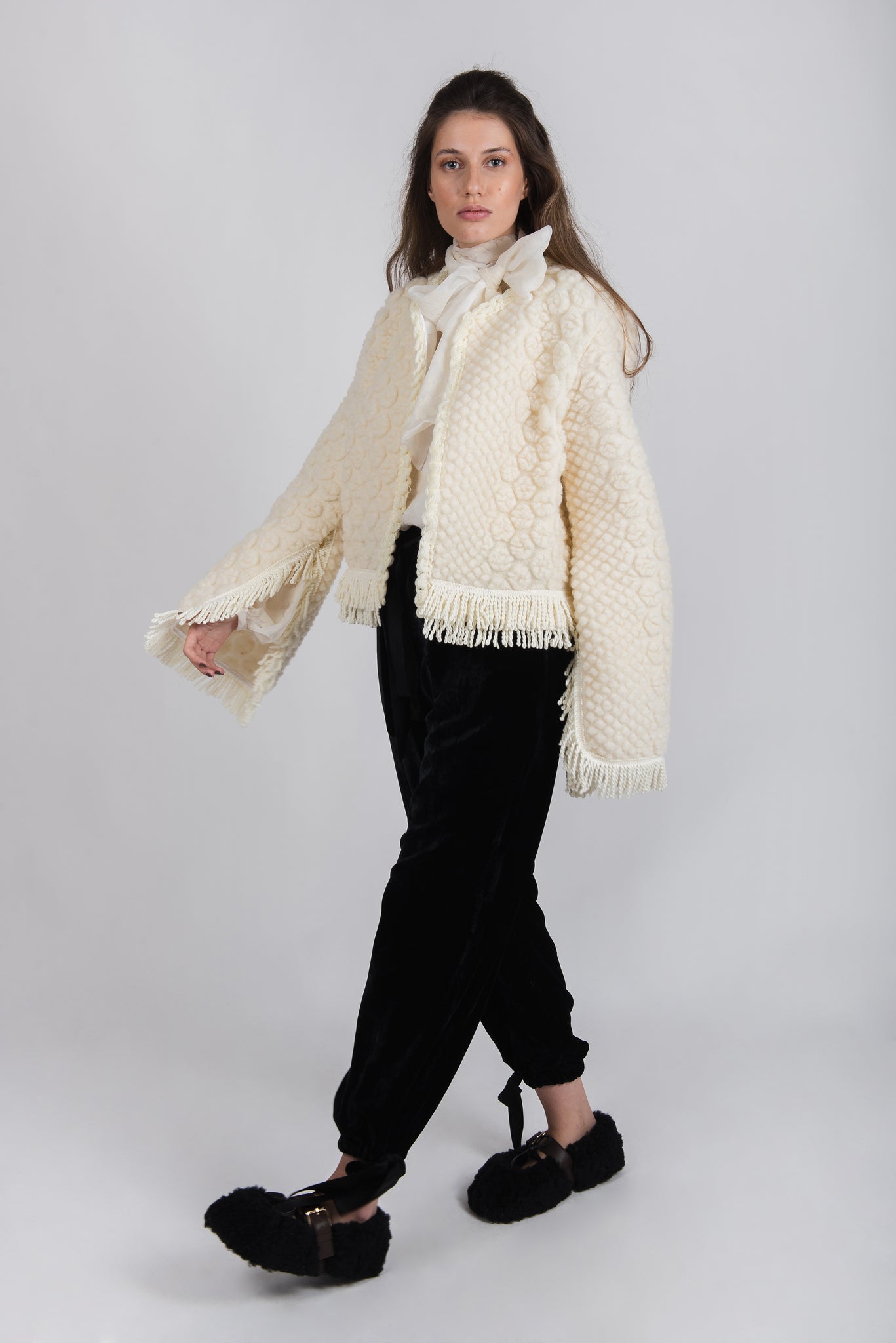 O jachetă scurtă din lână naturală, creată pentru a oferi căldură, lejeritate și eleganță firească. Textura densă, cu detalii fine și franjuri discrete, aduce un plus de personalitate fără a încărca silueta.