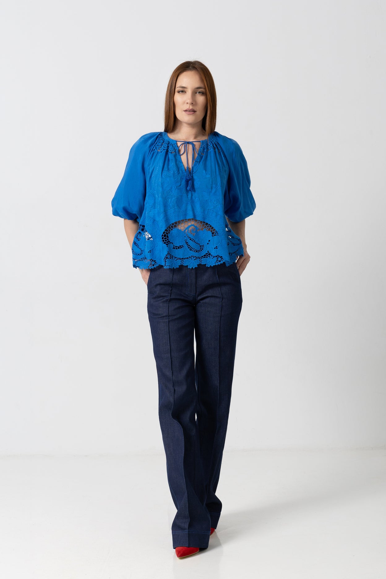 Macrame details on the sleeve and around the neck.