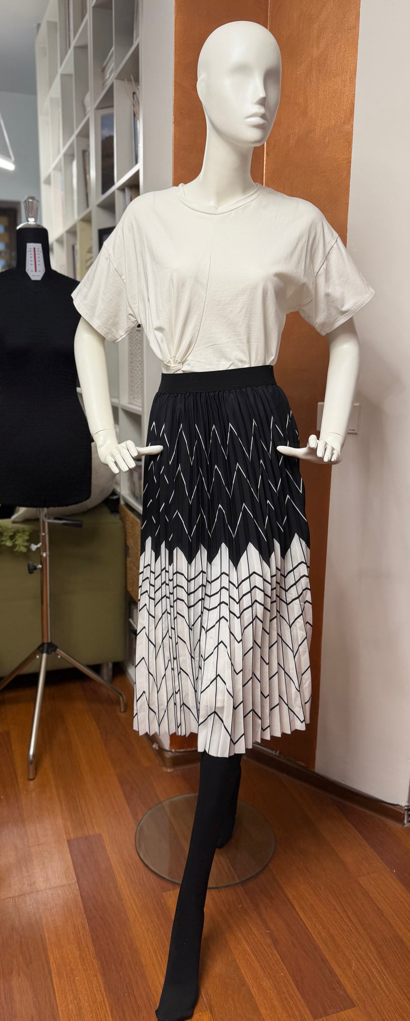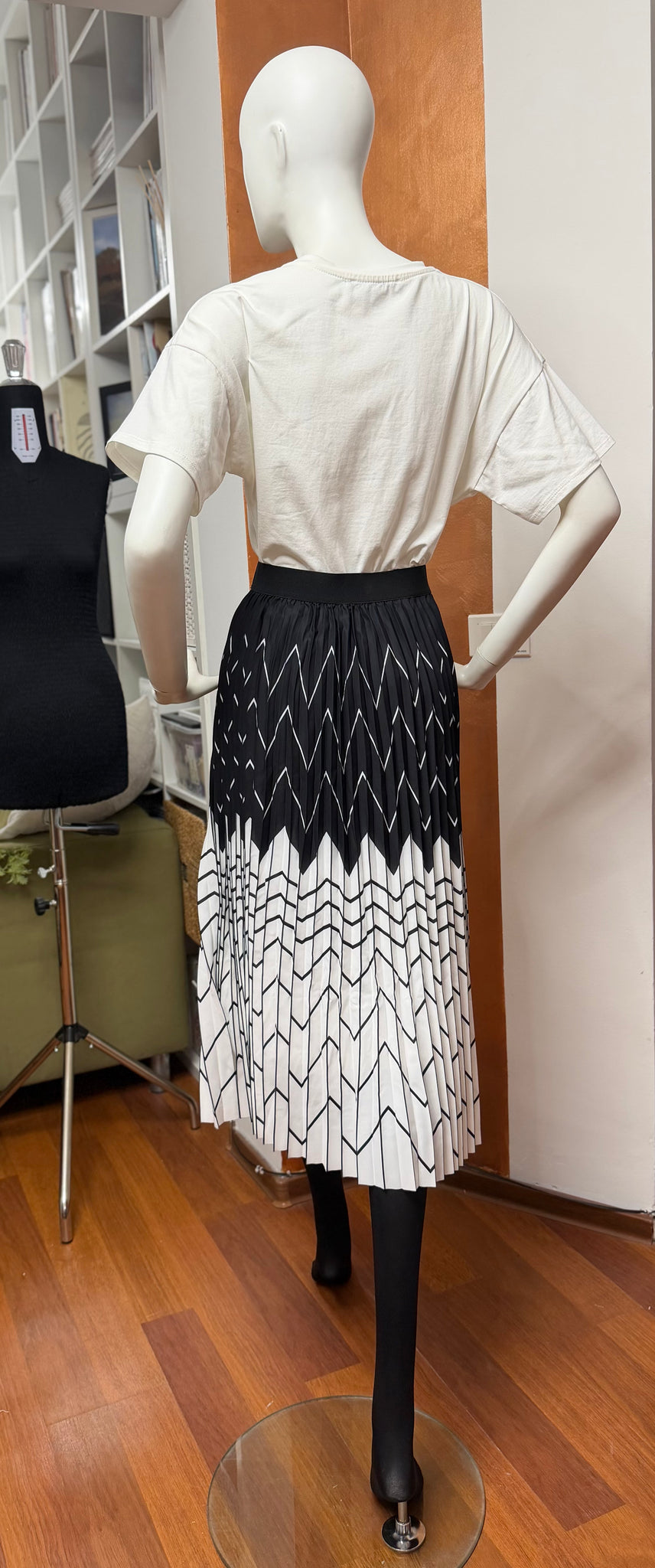 Modernă și sofisticată, această fustă midi plisată aduce un plus de eleganță oricărei garderobe. Designul în contrast alb-negru, cu imprimeu geometric rafinat, creează un efect vizual dinamic și alungește silueta, oferind o apariție feminină și bine definită.