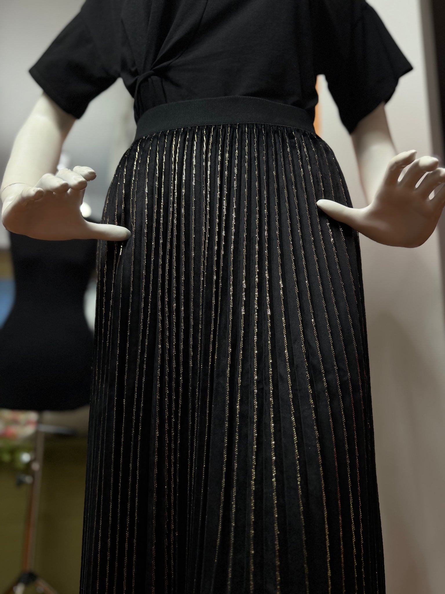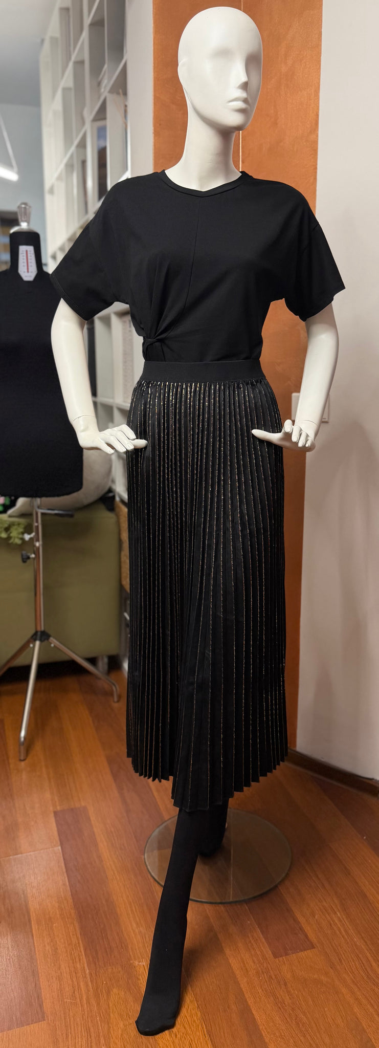 Elegantă și sofisticată, această fustă midi plisată este piesa statement ideală pentru ținute rafinate, cu accente moderne. Realizată într-o nuanță clasică de negru, fusta este pusă în valoare de inserțiile verticale aurii cu efect strălucitor, care adaugă profunzime și un subtil joc de lumină, alungind vizual silueta.