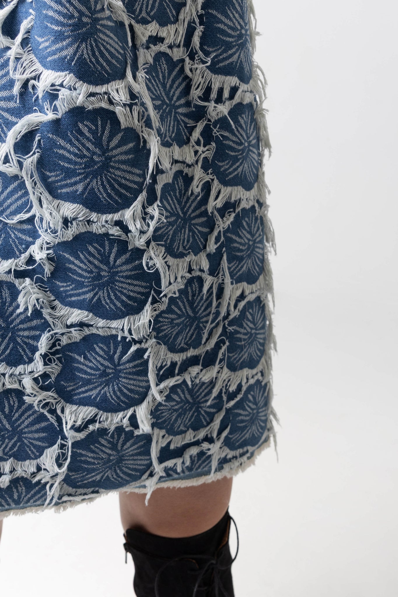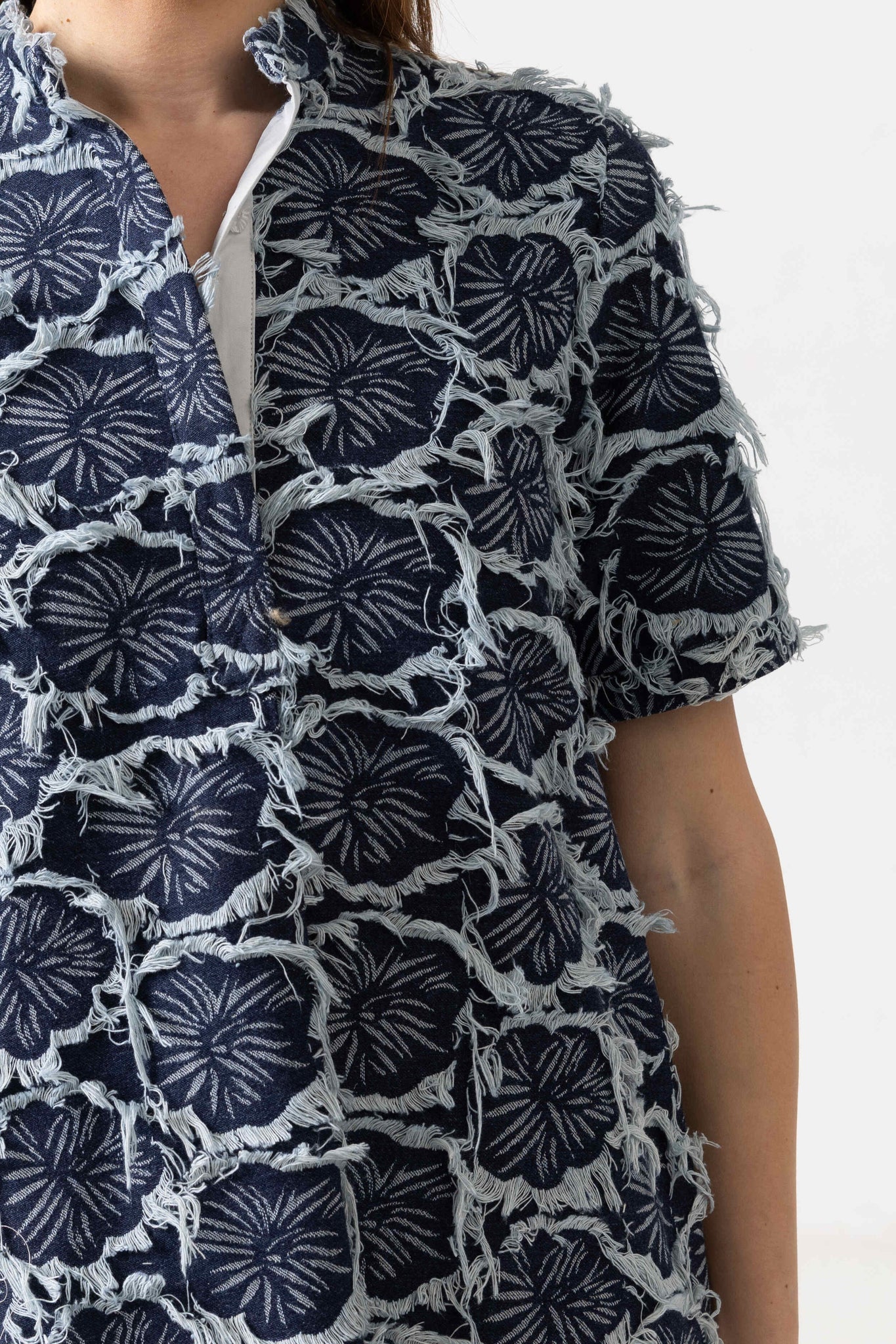 This midi length dress is made of embroidered tulle. Button slit down the center of the face and covered buttons. The waist is highlighted by pleats. The sleeves are loose and are not lined. Elastic in the shoulder area. Side pockets. It is fully lined.