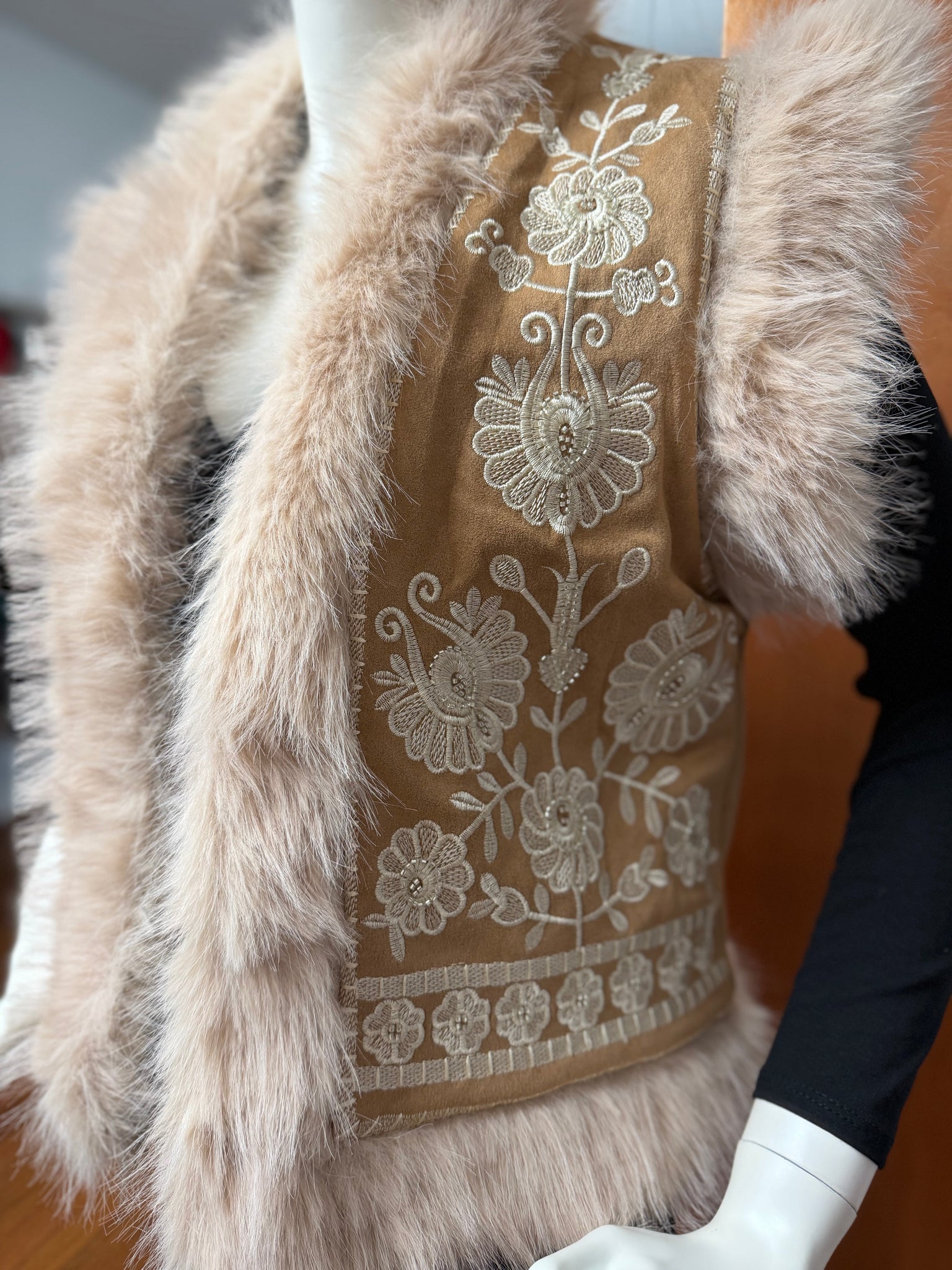 This midi length dress is made of embroidered tulle. Button slit down the center of the face and covered buttons. The waist is highlighted by pleats. The sleeves are loose and are not lined. Elastic in the shoulder area. Side pockets. It is fully lined.